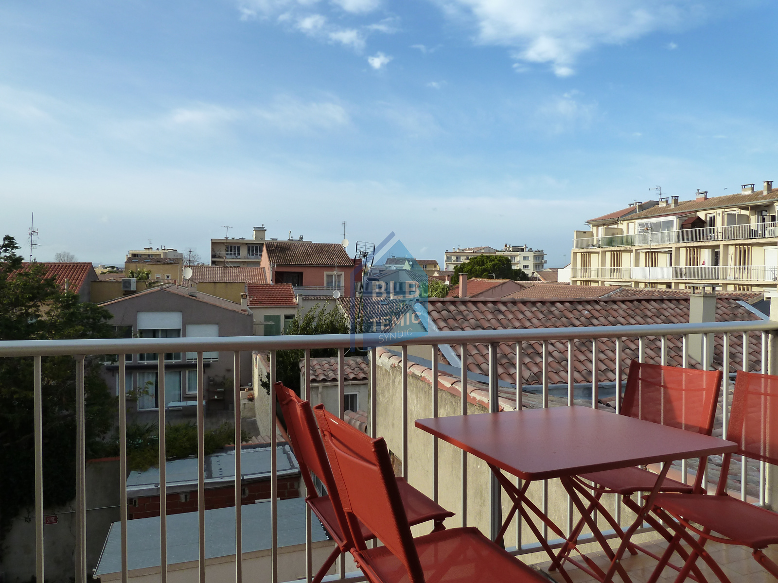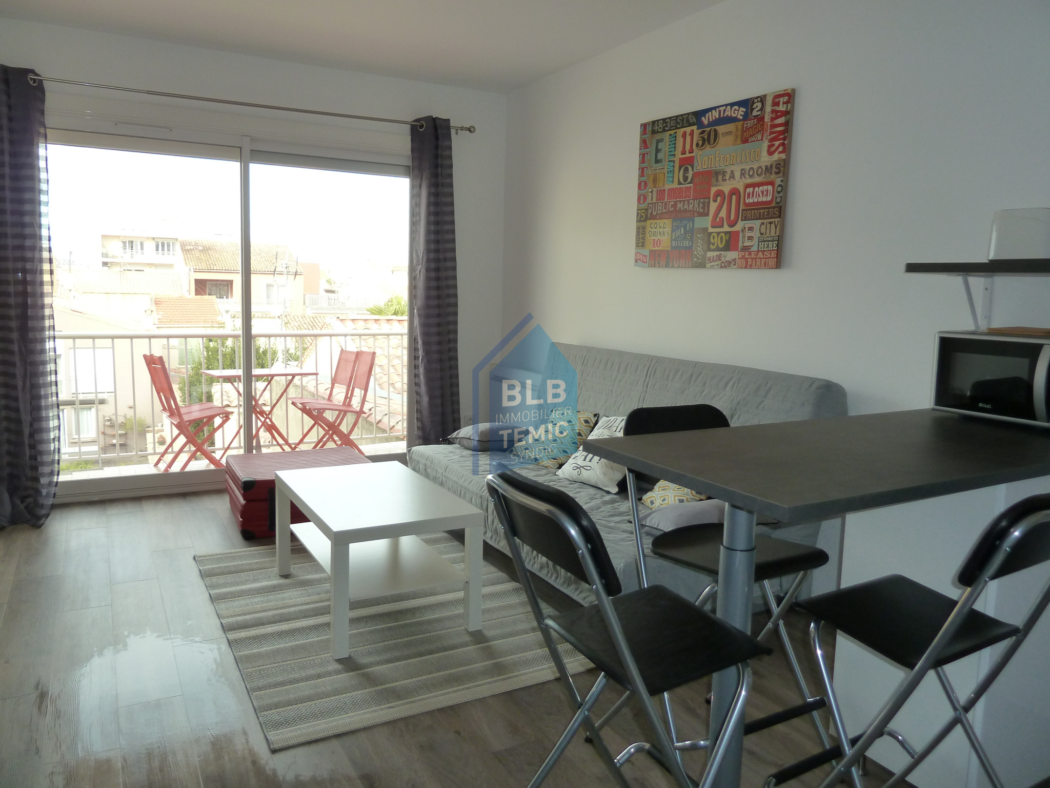 ,une cuisine équipée, un séjour avec un canapé convertible une télé écrant plat , une terrasse avec une belle vue sur le phare de palavas et les toits .