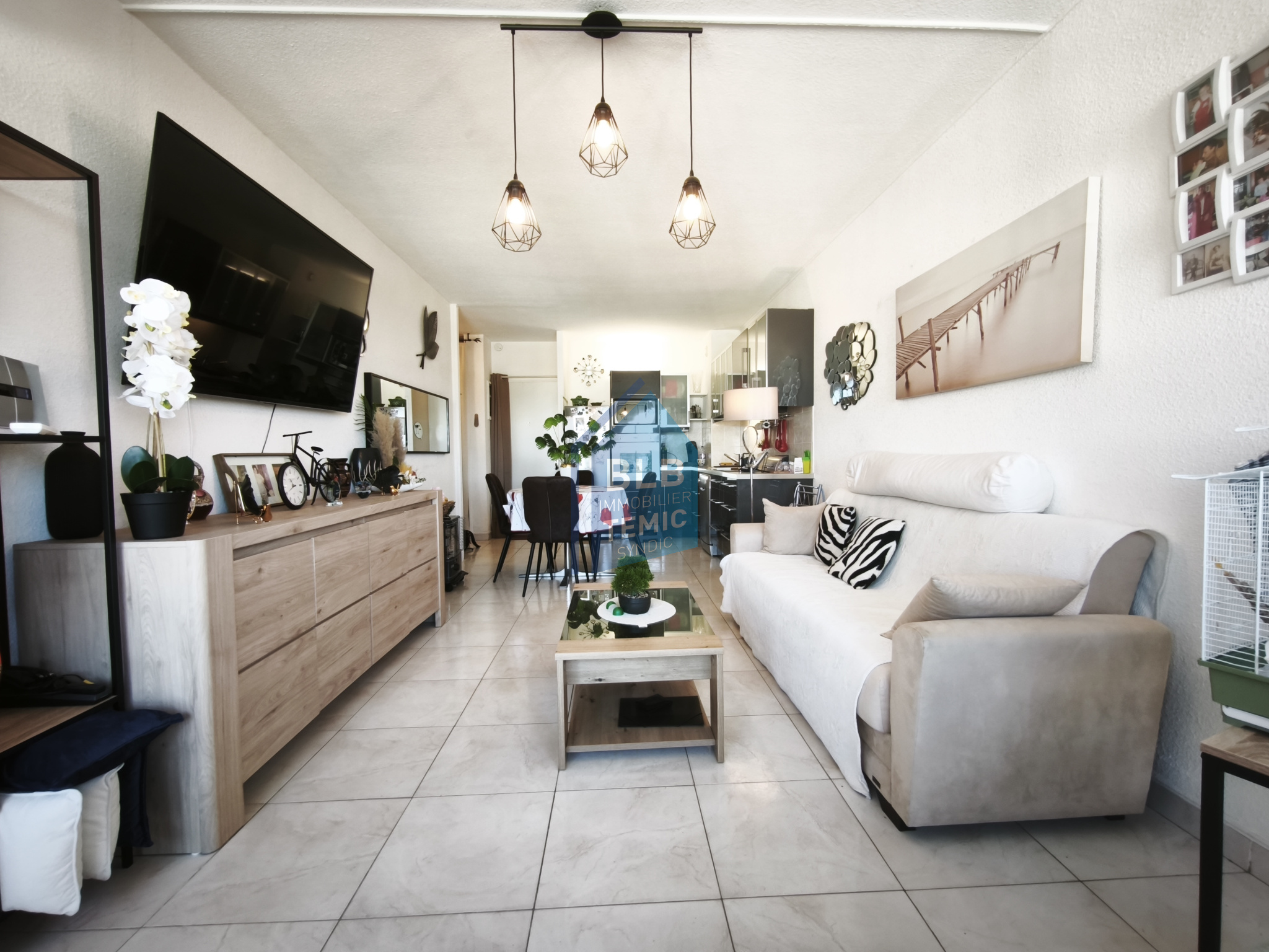 Grand séjour-cuisine lumineux, cuisine toute équipée et des placards de rangements bien optimisés afin de pouvoir aisément recevoir famille et amies